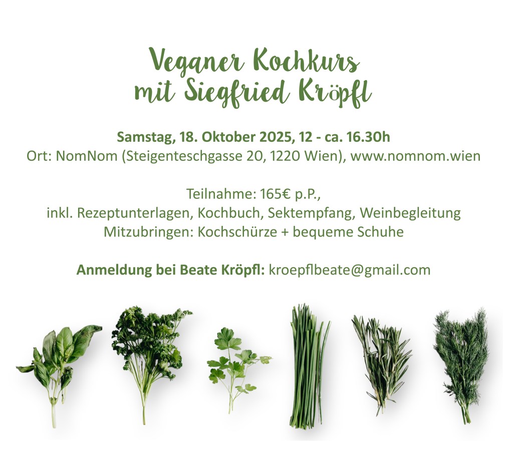Für Privatpersonen: Wenn Sie Interesse an einem privaten Kochkurs in Kleingruppen haben, kontaktieren Sie mich. Im Angebot inkludiert ist ein mehrgängiges Menü plus Rezeptunterlagen. Mehr Informationen auf Anfrage.